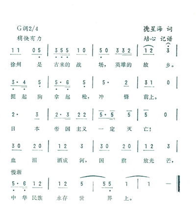 “徐州是古来的战场,英雄的故乡。挺起胸拿起枪,冲锋前上。日本帝国主义一定灭亡!血泪洒成河,国旗放光芒,中华民族永存世界上。”
