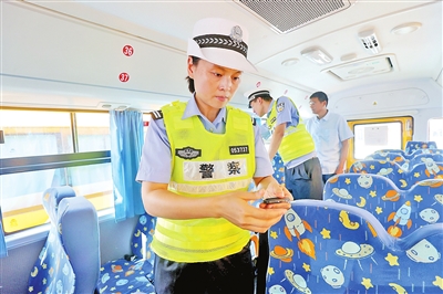8月22日,浙江省湖州市德清县公安局交通管理大队阜溪中队交警在检查校车安全带。 新学期开学临近,多地开展校车安全专项检查,及时排除隐患,确保学生乘车安全。(新华社发谢尚国摄)