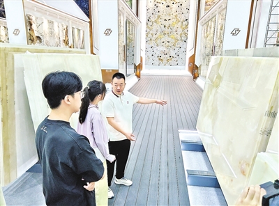 美轮美奂的巴西奢石背景墙、清新脱俗的石材山水画、精致典雅的玉石雕刻画、富丽堂皇的高端板材……初秋时节,记者来到位于云浮市“百里石材长廊”的瑞思石业看到,展示厅里客户在参观选购,会客厅里营销人员正在与客商沟通交流。从深圳过来拿货的客户云先生告诉记者:“此次前来主要是选购几栋别墅的装修材料,这里可提供选材、设计、测量、加工、安装、售后一体化服务,很方便。”