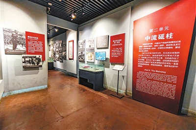 转过弯便是“中流砥柱”单元,这里的展陈以红色为主色调。一面巨大的电子屏上,滚动显示着东北抗日联军的战斗历程。全国抗战时期,中国共产党始终高擎抗日民族统一战线的旗帜,领导八路军、新四军及其他抗日人民武装深入敌后,开辟抗日根据地,建立抗日民主政权。1931年9月至1945年9月,东北抗日军民歼灭日军17万余人,敌后战场歼灭日军52.7万余人,收复国土约100万平方公里,为抗战作出了重要贡献,也付出了巨大牺牲。这段艰苦抗战的历史昭示中国共产党及其领导的抗日军队一直是全民族团结抗战,争取民族解放、国家独立的中流砥柱!