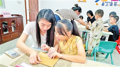 “妈妈,你扶着纸,我来钻孔好不好?”6岁的小淇小心翼翼地握着长针,在妈妈的协助下完成钻孔步骤;另一边,来自云浮市伊顿实验学校六年级的莫宗羲已经开始穿针引线,他按照“上下交替、松紧一致”的要领,将棉线在纸页间穿梭,不一会儿,松散的纸页便被牢牢固定。过程中,有的家庭因棉线打结略显手忙脚乱,有的则在反复尝试中找到技巧,阅览室内时而传来“加油”的鼓励声,时而响起成功的欢笑声,亲子间的默契在一针一线中不断升温。
