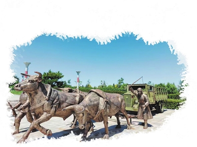 木凯淖尔镇的山梁上,“桃力民抗日根据地陈列馆”几个红色大字在骄阳下熠熠生辉,远远望去,那尊《三牛拉汽车》的雕塑静静伫立在广场中央,锈红色的金属车身爬满时光的纹路,3头耕牛弓着脊背奋力向前,牛角抵着车辕的弧度里还藏着当年的沙砾,宛如一位沉默的史官,将80多年前的烽火故事凝固成永恒的剪影。