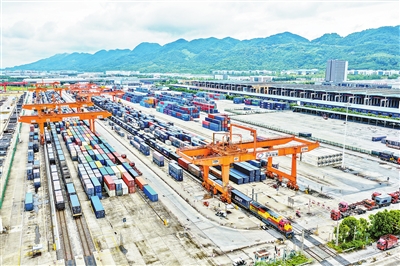 9月8日,满载“重庆造”汽车的中欧班列(成渝)在重庆团结村中心站等待发车(无人机照片)。