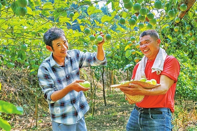 “‘钦密9号’甜度高、口感佳、适合山地种植、市场接受度高,零售价在10元/斤左右,产品供不应求。如今,通门黄金百香果种植面积已从20亩扩展到3000多亩,年产量超700万斤,黄金百香果已真正成为富民兴村好产业。”朱伯说。