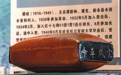 在赣西抗战博物馆,陈列着一个梅占花魁纹褐色长方形皮枕,枕头侧面写有“完成革命”的字样。这不是一个普通的枕头,而是革命烈士谭斌的遗物。