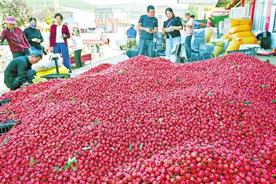 近日,山东省新泰市山楂陆续成熟,当地果农忙着进行山楂收获、运输、存储等工作。近年来,新泰市因地制宜发展山楂产业,当地山楂种植面积达4.7万余亩,山楂产业已成为带动当地群众增收致富的特色产业。 (新华社记者徐速绘摄)