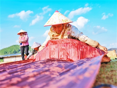 近日,晨光穿透薄雾洒在新兴县水台镇的大地上,数十匹浸染薯莨汁的香云纱正在草坪上铺展,宛如流动的褐色河流。村民梁伯手持蒲葵叶扫帚,将吸吮了淋漓薯莨汁的胚绸上的气泡一一扫却,动作娴熟如抚琴弦,“这片晒场两年前还是荒废的山地,如今成了‘丝绸软黄金’的摇篮”。这番景象,正是水台镇推进“百千万工程”以来,以香云纱非遗项目赋能该镇农文旅融合发展与乡村振兴的生动注脚。