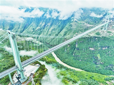 9月26日,雨后的贵州花江大峡谷云雾笼罩,花江峡谷大桥如同“钢铁巨龙”腾跃峡谷之上。花江峡谷大桥是贵州六枝至安龙高速公路的控制性工程,大桥全长2890米,主跨径1420米,是目前世界山区峡谷第一大跨度钢桁梁悬索桥;其桥面距水面垂直高度625米,是新的世界第一高桥。经过三年多建设,贵州花江峡谷大桥将于9月28日正式建成通车。 (新华社记者欧东衢摄)