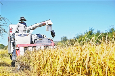 金秋时节,内蒙古兴安盟乌兰浩特市的水稻喜迎丰收。农户们抢抓晴好天气,加紧收割加工。 (新华社记者贝赫摄)