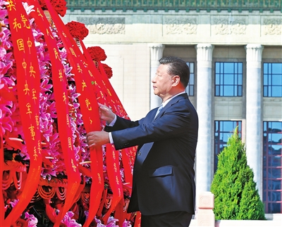 习近平迈步上前,仔细整理花篮缎带。随后,习近平等党和国家领导人缓步绕行,瞻仰人民英雄纪念碑。
