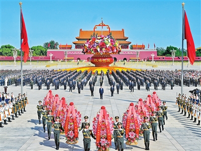 方阵前,以中共中央,全国人大常委会,国务院,全国政协,中央军委,各民主党派、全国工商联和无党派爱国人士,各人民团体和各界群众,老战士、老同志和烈士亲属,中国少年先锋队名义敬献的9个大型花篮一字排开,花篮红色缎带上书写的“人民英雄永垂不朽”格外醒目。