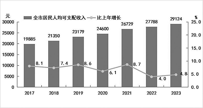 全年全市居民人均可支配收入29124元,比上年增长4.8%。按常住地分,城镇居民人均可支配收入35348元,同比增长3.0%;农村居民人均可支配收入23856元,同比增长6.3%。城乡居民收入比由2022年的1.53缩小为1.48。