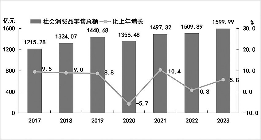 全年社会消费品零售总额1599.99亿元,比上年增长5.8%。按经营地统计,城镇消费品零售额1127.24亿元,增长5.4%;乡村消费品零售额472.75亿元,增长6.8%。按消费类型统计,商品零售1380.44亿元,增长4.1%;餐饮收入219.55亿元,增长18%。图7 2017-2023年社会消费品零售总额及增长速度