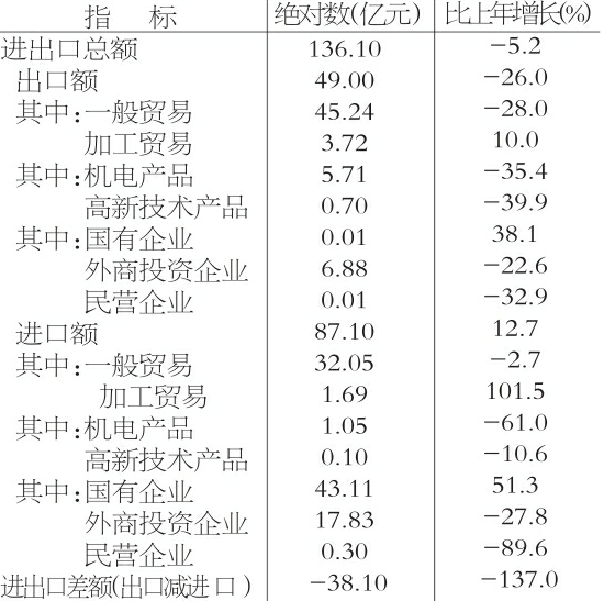 全年进出口总额136.10亿元,比上年下降5.2%。其中,出口49.00亿元,下降26.0%;进口87.10亿元,增长12.7%。进出口逆差(出口减进口)38.1亿元,下降137.0%。