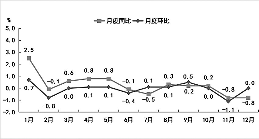 全年居民消费价格比上年上涨0.3%。分类别看,食品烟酒类价格上涨0.8%,衣着类价格下降0.4%,居住类价格下降0.7%,生活用品及服务类价格上涨0.7%,交通和通信类价格下降3.0%,教育文化和娱乐类价格上涨4.7%,医疗保健类价格与上年持平,其他用品和服务类价格上涨1.2%。