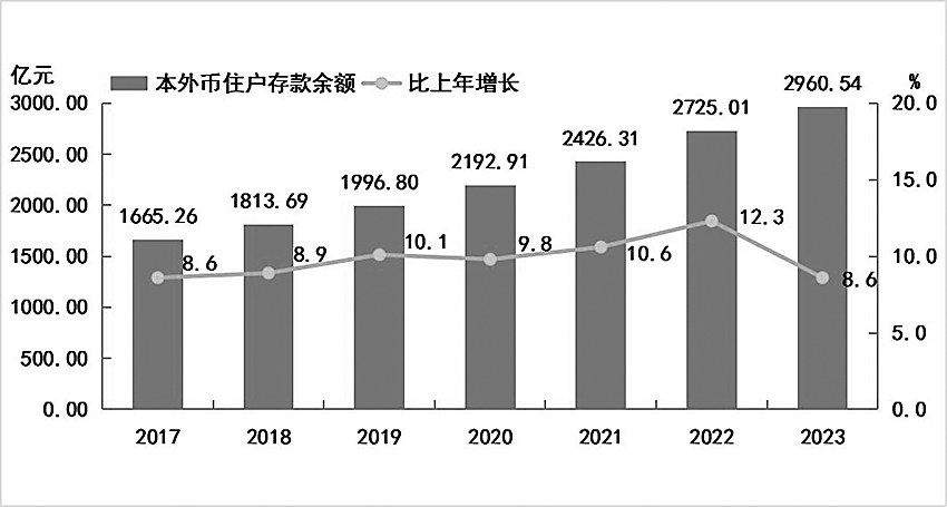 图8 2017-2023年本外币住户存款余额及增长速度