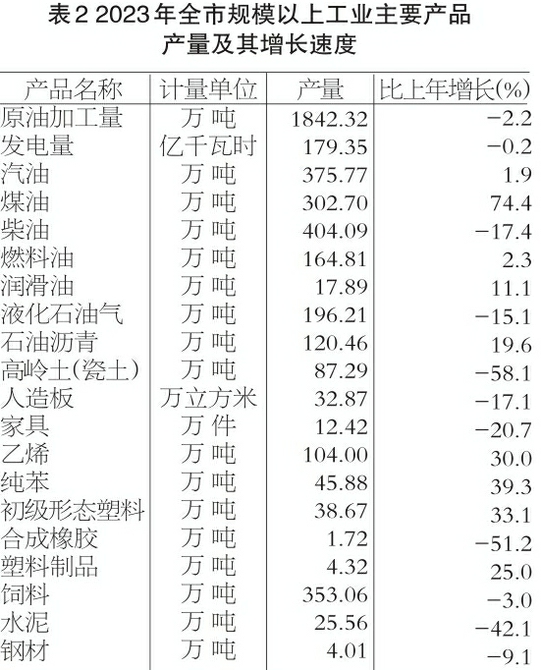 全年全部工业增加值比上年增长5.0%。规模以上工业增加值增长5.4%,分隶属关系看,中央省属企业增长1.8%,地方企业增长12.2%;分企业规模看,大型企业增长1.7%,中型企业增长24.8%,小微企业增长2.8%;分行业看,农副食品加工业下降1.0%,石油加工业增长1.1%,化学原料及化学制品制造业增长30.8%,非金属矿物制品业下降6.3%,医药制造业增长9.3%。规模以上工业全年全员劳动生产率91.1万元/人年,产品销售率98.4%。