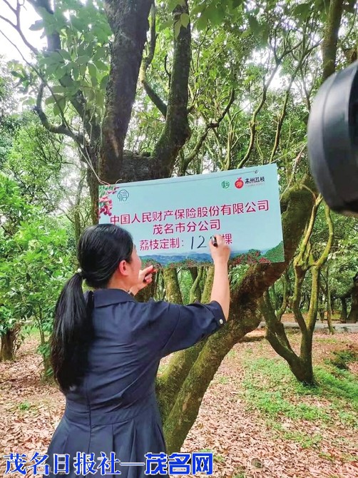 人保财险茂名市分公司代表在荔枝定制活动现场挑选荔枝树并挂上定制牌。 通讯员李虹摄