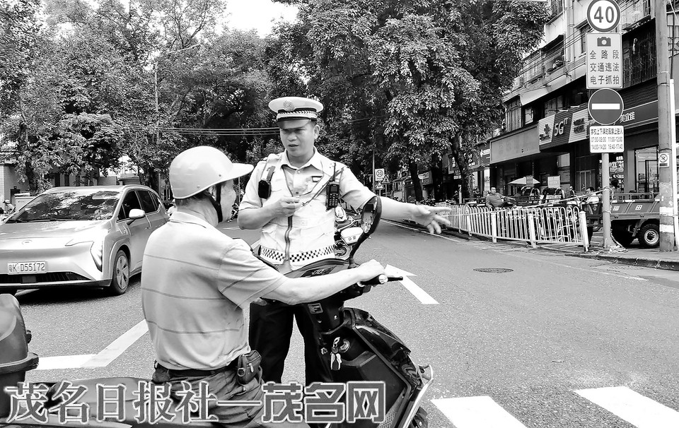 放学时段,交警在为民东路执勤,向市民宣传该路段限时禁行的相关措施。 茂名日报社全媒体记者岑稳摄