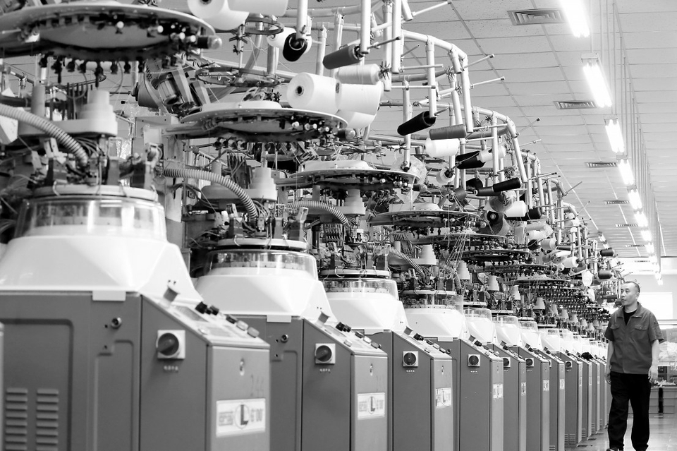 5月17日,山东省青岛市即墨区通济街道一家制袜企业的工人在生产出口的袜子产品。 新华社发(梁孝鹏摄)