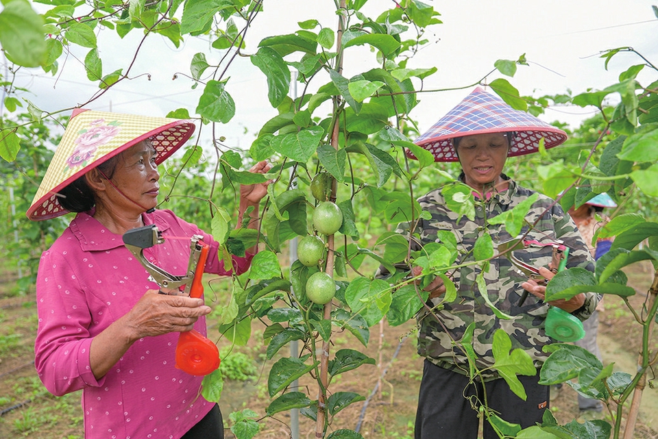 ▲百香果种植基地里,村民正在护理百香果。如今,百香果已成为当地村民增收致富的产业。