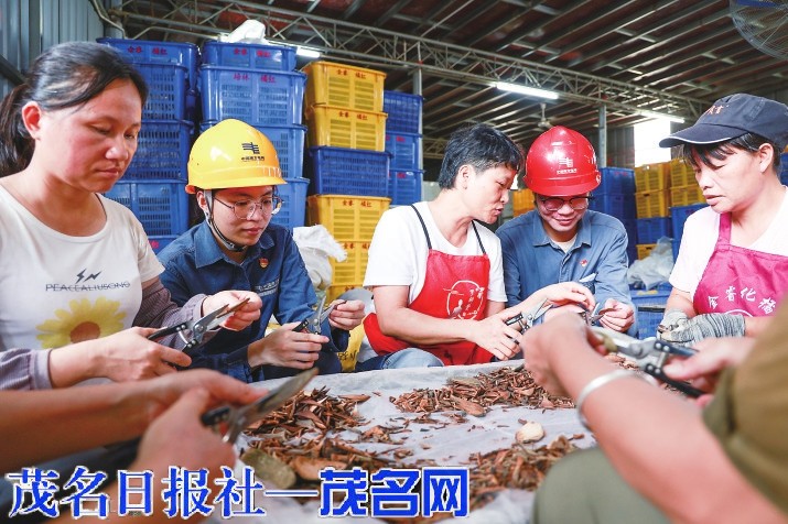 ?一边与化橘红厂工人一起剪橘红皮,一边宣传普及安全用电知识。