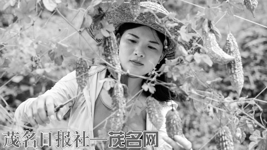 大图:贵子麒麟苦瓜种植基地。小图:新农人采摘苦瓜。茂名日报社全媒体记者吴佰洋摄