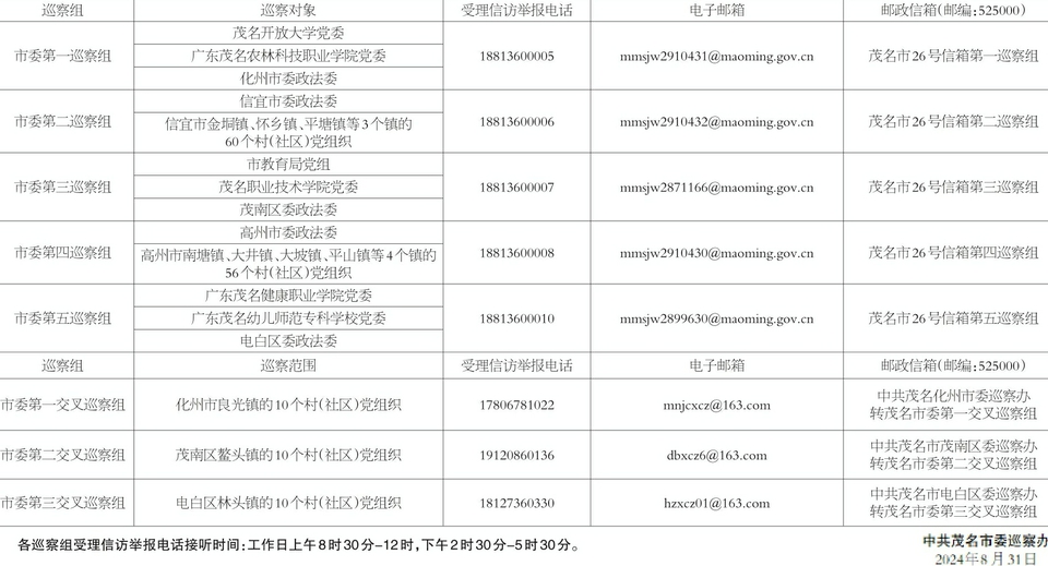 根据市委巡察工作统一部署,市委巡察组从2024年8月下旬至2024年11月下旬,对市教育局、茂名职业技术学院、茂名开放大学、广东茂名健康职业学院、广东茂名幼儿师范专科学校、广东茂名农林科技职业学院等6个单位党组织开展常规巡察,对5个区(县级市)党委政法委开展提级巡察,对信宜市60个、高州市56个村(社区)党组织开展“百千万工程”专项巡察。8月下旬至9月下旬,市委组织3个交叉巡察组,分别对茂南区、电白区、化州市各10个村(社区)党组织开展“百千万工程”专项交叉巡察。
