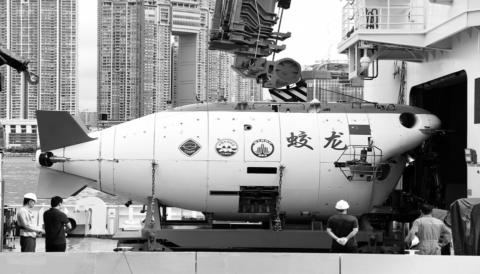 这是停靠于香港尖沙咀海运码头的“深海一号”远洋科考船上的“蛟龙号”。新华社记者 陈铎 摄
