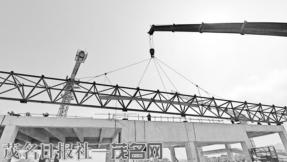 首榀钢结构桁架吊装前,施工单位精心准备吊装工作。 茂名日报社全媒体记者 岑稳 摄