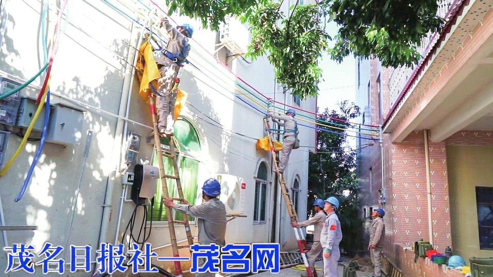 高州供电局全力推进根子镇整线(成片)标准化治理工作,图为工作人员对低压线路进行改造升级。 通讯员 李林广 摄