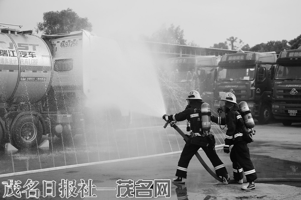消防员使用水幕对罐体进行冷却降温。茂名日报社全媒体记者 吴昊 摄