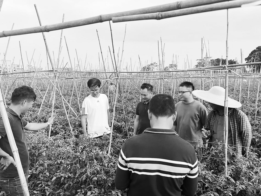 本报讯 为进一步推进“百千万工程”在树仔开花结果,电白区树仔镇党委、镇政府统筹协调各方帮扶力量全方位推进乡村振兴帮扶工作。11月5日,驻树仔镇帮扶工作队诚邀广东省农业科学院郑锦荣教授等专家到树仔镇开展农业专题调研及产业技术指导。郑教授团队围绕农业种植管理、产业技术指导及科技咨询服务,聚焦本土特色种植产业,就圣女果、百香果等经济作物种植中遇到的技术问题为农户耐心解答并给予科学指导。