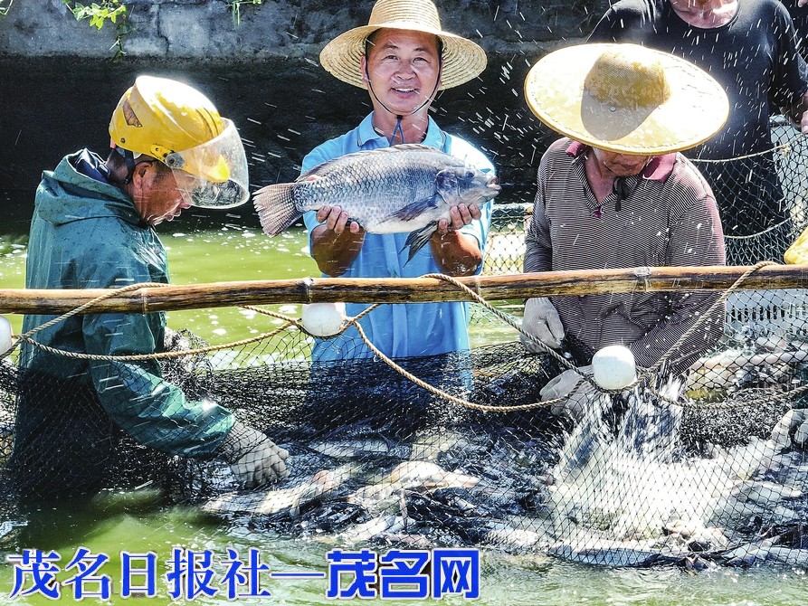 茂南区把“一条鱼”发展战略作为“百千万工程”重点工作来抓,发挥“中国罗非鱼之都”核心区优势,携手佛山市禅城区共同推进罗非鱼特色产业协作,“一条鱼”产业游出了富民兴村路。坚持以系统思维培育发展特色产业,从罗非鱼种苗养殖、深加工、销售等全链条精准培育、精准招商,今年已引入京塘农业、宝路等一系列罗非鱼重点项目。同时,创新打造标准化品牌化体系,构建产业高质量发展服务体系,出台金融支持罗非鱼产业高质量发展奖补办法,着力建设科技、金融、政务、检测、交易五个中心,大力创建国家现代农业产业园,打造全国渔业绿色循环发展试点,以一系列的组合拳,推动罗非鱼产业经济规模扩大、市场销量增大、产业增收,实现联农带农富农更好成效。图为公馆镇油甘窝养殖户捕捞成品罗非鱼。