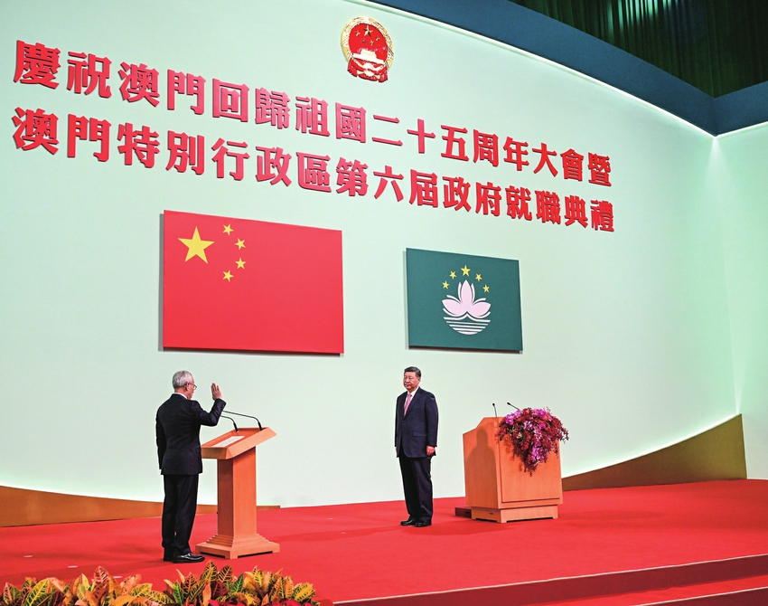 新华社澳门12月20日电(记者朱基钗、赵博、张研)庆祝澳门回归祖国25周年大会暨澳门特别行政区第六届政府就职典礼20日上午在澳门东亚运动会体育馆隆重举行。中共中央总书记、国家主席、中央军委主席习近平出席并发表重要讲话。他指出,澳门回归祖国25年来,具有澳门特色的“一国两制”实践取得巨大成功,澳门发生翻天覆地的变化,国际影响力大幅提升。他希望,新一届澳门特别行政区政府团结带领社会各界,抢抓机遇、锐意改革、担当作为,更好发挥“一国两制”制度优势,不断开创“一国两制”事业高质量发展新局面。