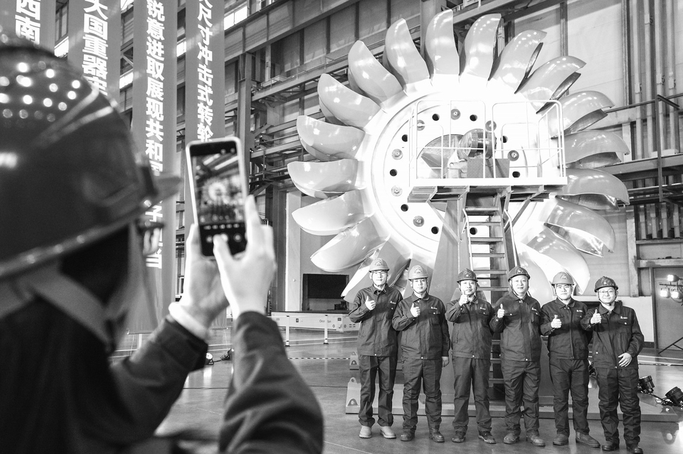 12月30日,在哈电集团哈尔滨电机厂有限责任公司生产车间,工作人员在冲击式水轮机转轮前合影留念。
