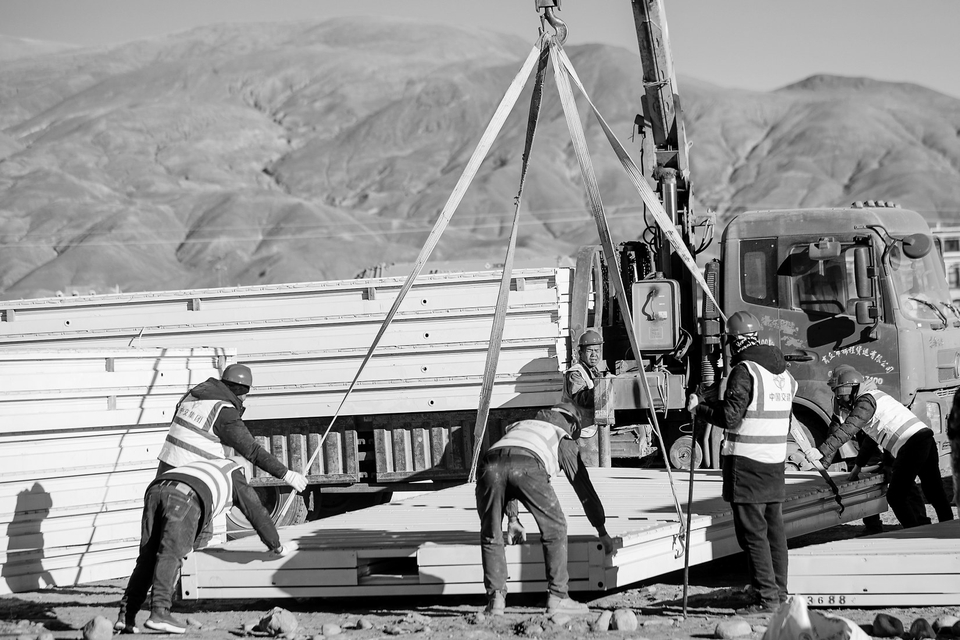 中建八局二公司党群部负责人刘敏正在指挥搭建折叠箱房。她说,地震后,公司立即联系拉萨的板房生产企业,连夜加工出40套折叠箱房,无偿捐赠给受灾群众。