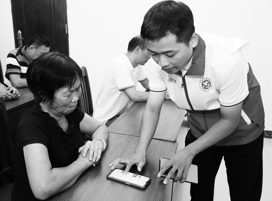 志愿者手把手教老人使用智能手机点外卖。茂名日报社全媒体记者 李颜东 摄