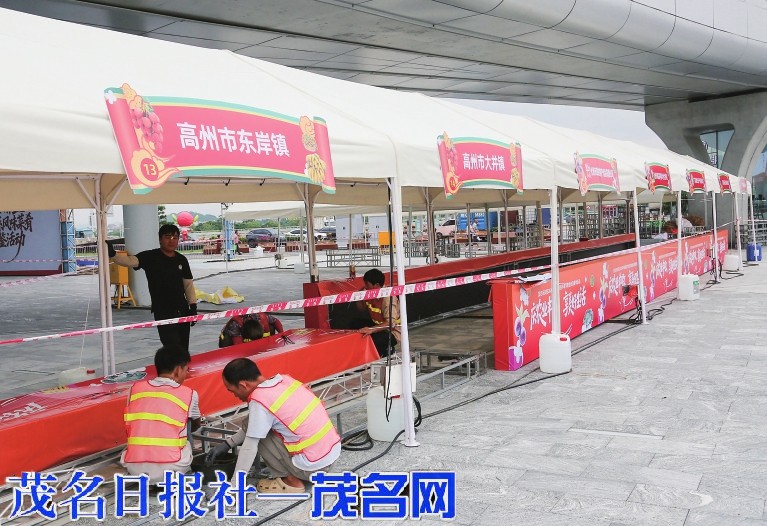 昨天,施工人员正在加紧布置特色农副产品展位。