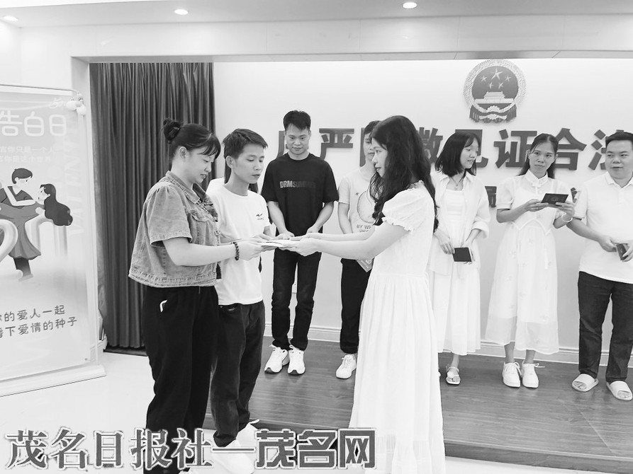 在浓厚的婚嫁氛围中,新人齐声宣读结婚誓言,字字铿锵有力,充分彰显责任与坚守。领导化身颁证员,在亲朋好友的共同见证下,将结婚证逐一递到新人手中并送上爱的祝福;登记员化身“甜蜜使者”,耐心为新人全面介绍周边配套的“爱情打卡点”,新人不约而同表示感兴趣。随后,他们纷纷前往打卡附近的“网红点”沾沾喜气,沉浸式体验休闲、旅游、购物、文化体验于一体的“一站式服务”,共同开启“甜蜜”新征程。这一幕,正是茂名以民心为向度,绘就好心之城幸福图景的生动缩影。