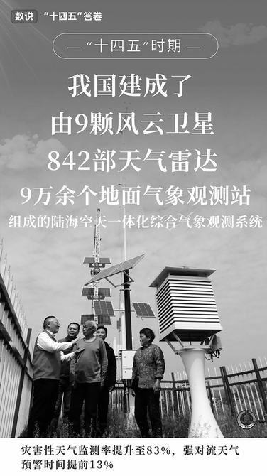 我国建成了由9颗风云卫星、842部天气雷达、9万多个地面气象观测站组成的陆海空天一体化综合气象观测系统,灾害性天气监测率提升到83%,强对流天气预警时间提前13%……一组来自发布会的数据显示,“十四五”时期我国气象现代化水平快速提升。