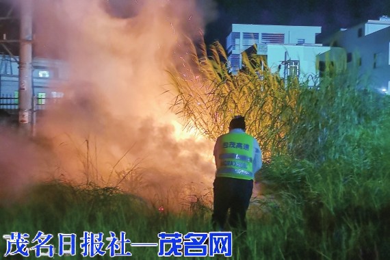 近日19时许,包茂高速茂名东站当值班长陈国瑜听到休息室窗外传来阵阵“噼啪”声,靠近窗户时发现后方草丛中冒出滚滚浓烟,明火在夜色中肆意“起舞”……