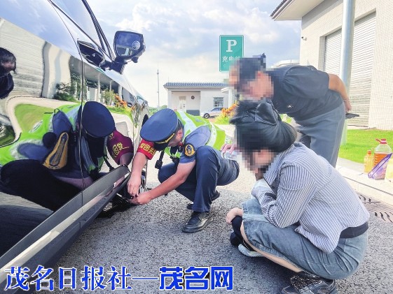 在茂湛高速官渡站场,值班站长吕其娣与工作人员吕博强帮助小车更换备用轮胎。