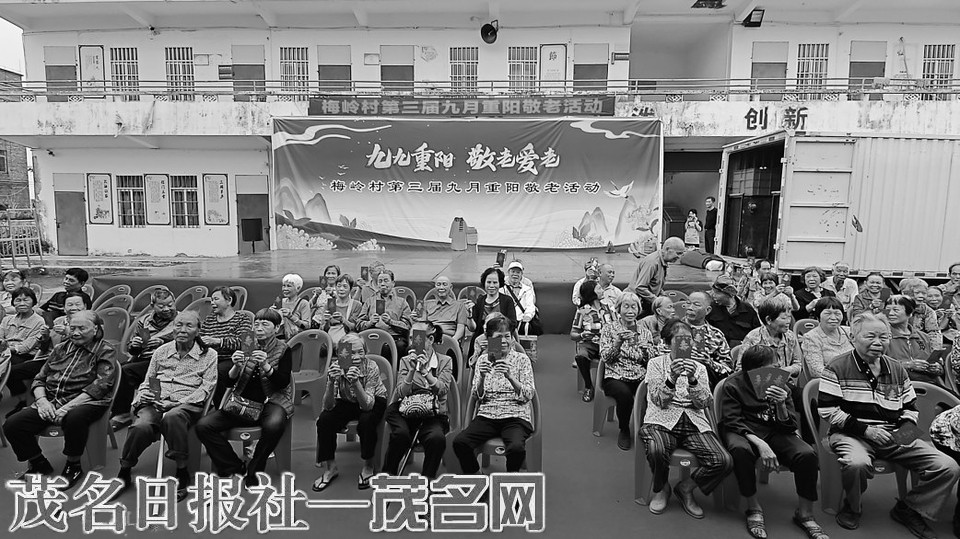本报讯 10月25日,茂南区鳌头镇梅岭村内彩旗飘扬、笑语盈盈,第三届重阳敬老活动如期举行(如右图,茂名日报社全媒体记者莫积均摄)。通过文艺表演、爱心慰问、团圆家宴等丰富形式,传承孝善文化,共庆重阳佳节,绘就和美乡村幸福图景。