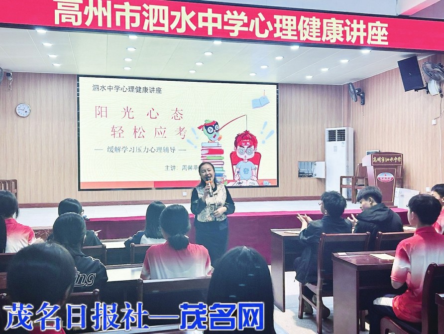 本报讯 为帮助学生科学缓解学习压力,培养积极心态,高州市泗水中学于10月28日在综合楼会议室举办了“放松身心·轻松学习”为主题的缓解学习压力心理健康讲座,讲座特邀周馨苹老师主讲,在专业引导中学习心理调适技巧。