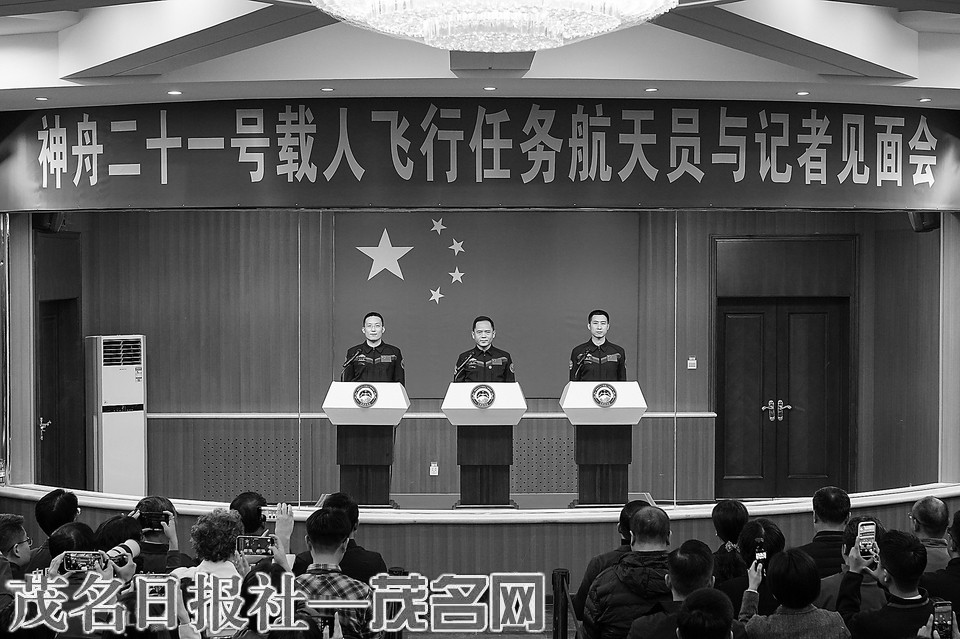 10月30日,神舟二十一号载人飞行任务航天员张陆(中)、武飞(右)、张洪章在酒泉卫星发射中心问天阁与媒体记者集体见面。新华社记者 李明刚 摄