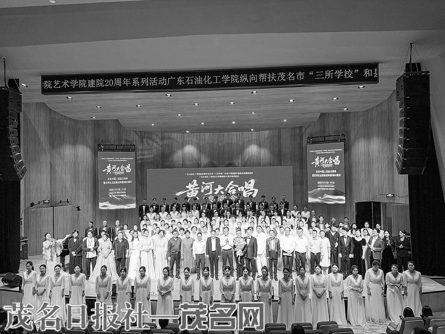 11月2日晚,广东石油化工学院(西城校区)艺术楼音乐厅内座无虚席、掌声如潮。一场以“纪念中国人民抗日战争暨世界反法西斯战争胜利80周年”为主题的《黄河大合唱》专场音乐会在此上演(如图),这是广东石油化工学院艺术学院建院20周年系列活动的重要组成,更是该校展示纵向帮扶茂名市“三所学校”和县中质量提升美育成果的生动实践。茂名市教育局相关领导、教育界代表及师生共赴这场红色音乐盛宴,共同见证这场用歌声传承红色基因的精彩演出。
