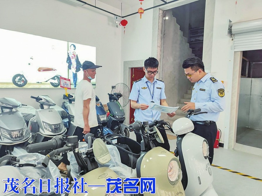 本报讯 在茂名滨海新区一家电动车销售点,执法人员俯身细致核验3C认证信息,精准检测限速装置完整性(如右图)。这是茂名市市场监督管理局滨海新区分局联合公安、消防等部门开展联动执法的一个缩影。