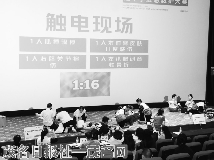 本报讯 昨日上午,茂名爱尔眼科·2025年茂名市红十字应急救护大赛决赛在市文化影城举行,为期2天的赛事圆满完成。本次大赛以“坚定跟党走,关爱在身边”为主题,以“以赛促学强技能,急救护民保健康”为目标,既是对我市应急救护培训成果的集中检阅,也是一次生动的全民急救科普实践。