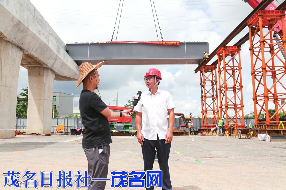 严志强记者(左)在茂名大道快速化改造(一期)项目建设现场采访。茂名日报社全媒体记者李颜东摄